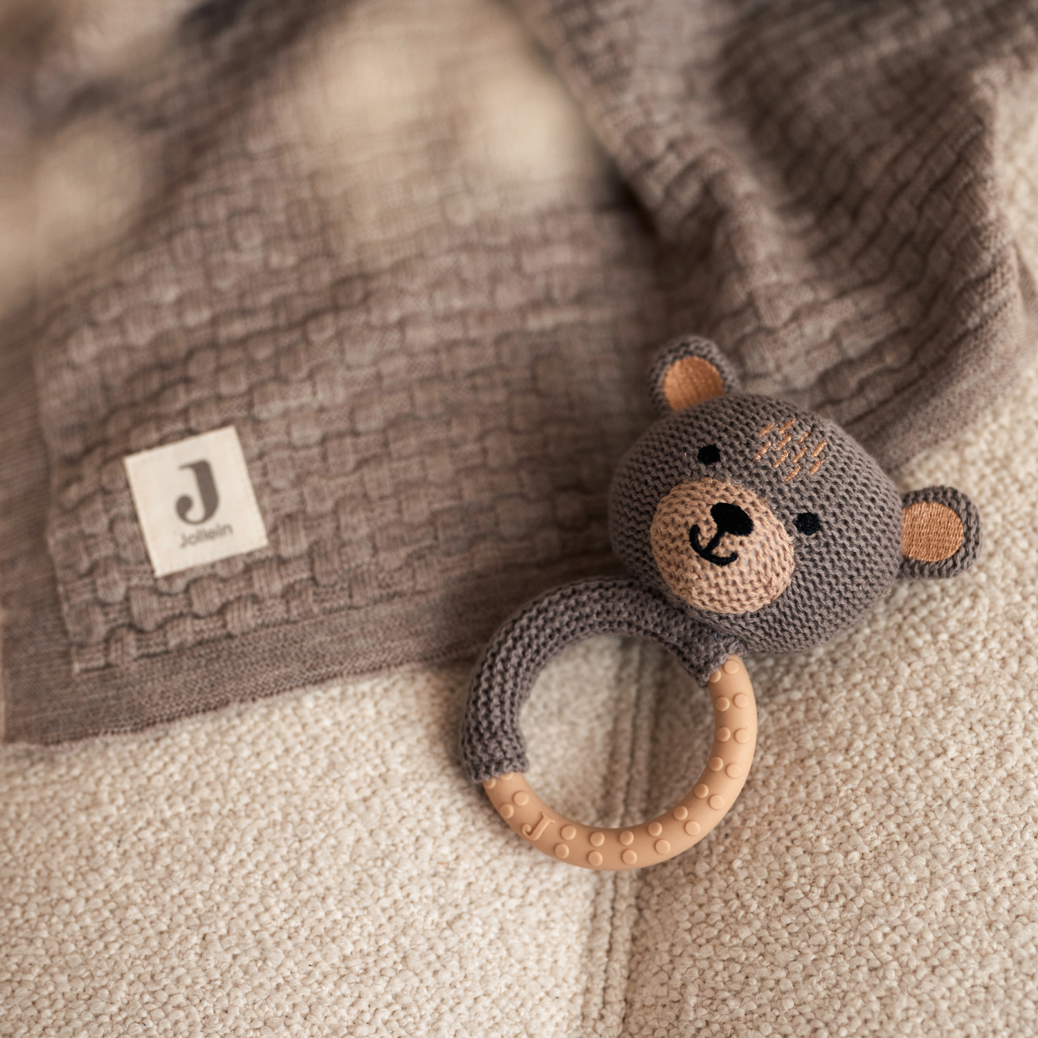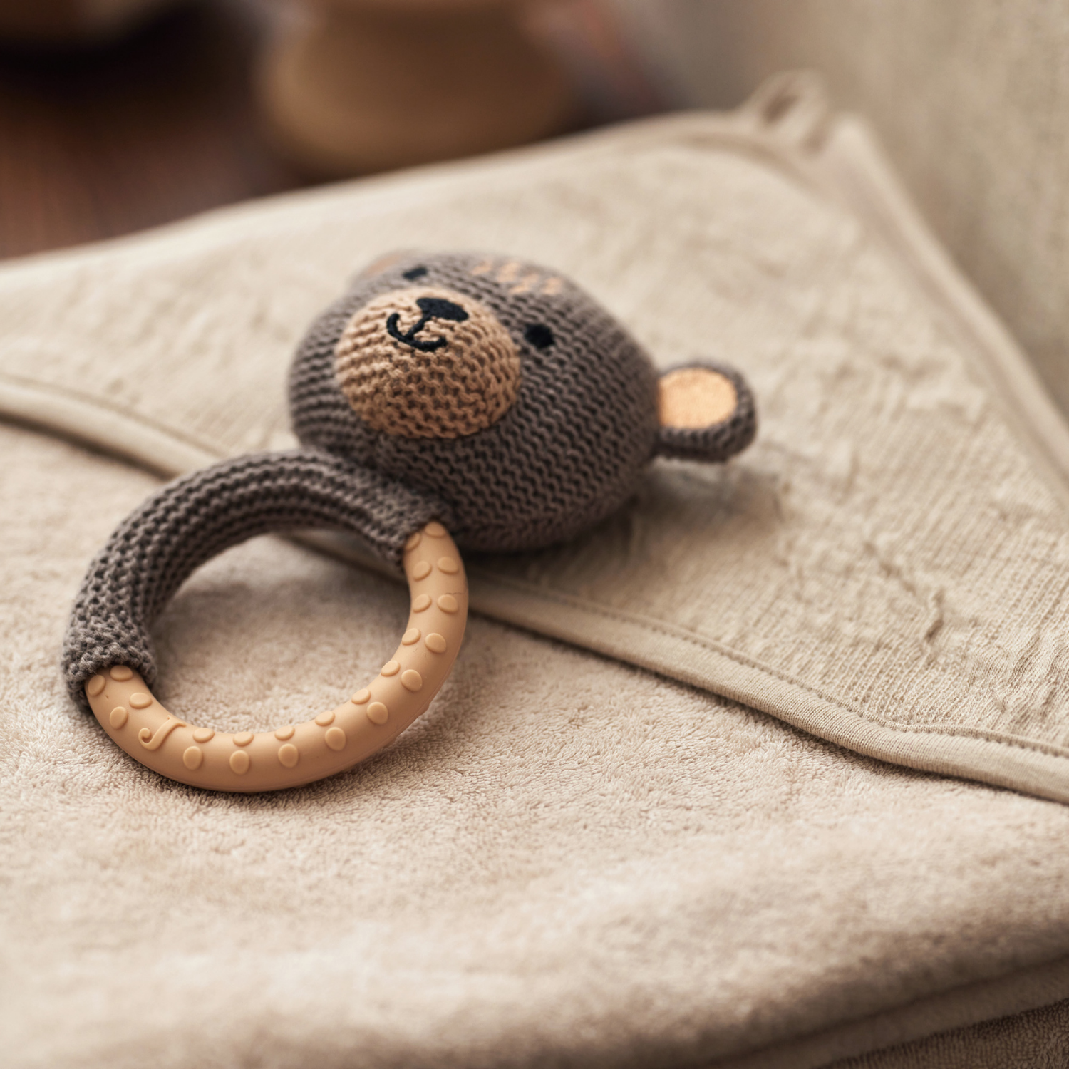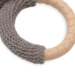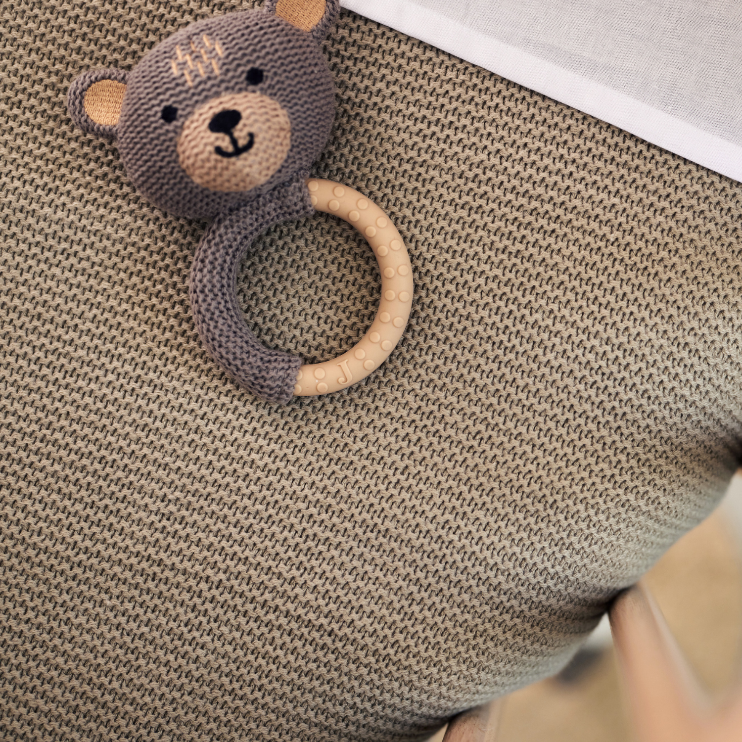 Beruhigender Beißring mit gestricktem Kopf und kleinen Glöckchen – lindert Zahnschmerzen und macht Spaß beim Spielen. Perfektes Geschenk zur Geburt.