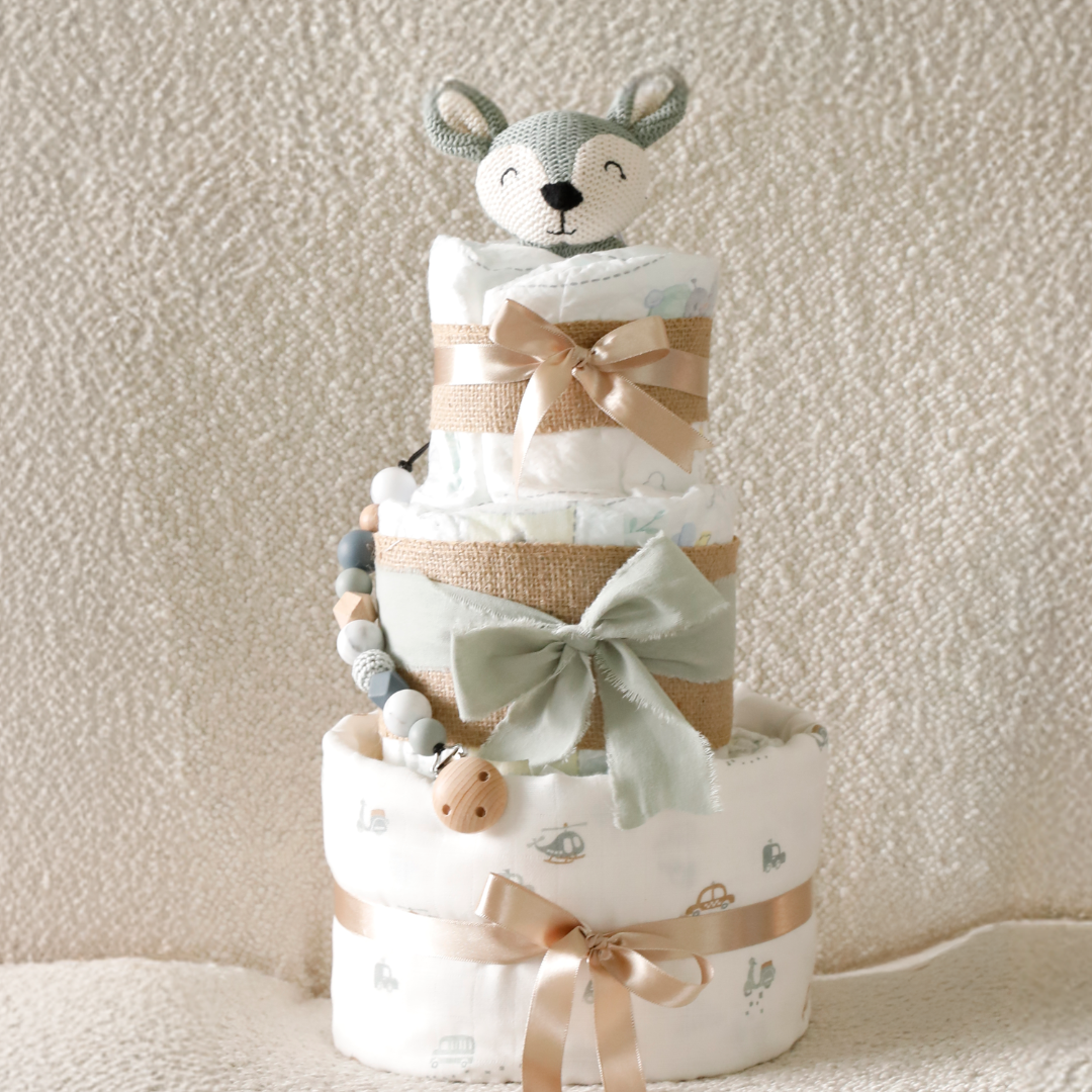 Our diaper cakes are more than just a beautiful eye-catcher for a new baby: They combine practicality with loving details and are handcrafted with great care. Each cake contains high-quality diapers and lovingly selected baby accessories – from cute rattles and muslin cloths to little surprises. Whether neutral, for girls or boys – a diaper cake is a practical yet heartfelt gift that is guaranteed to be remembered.